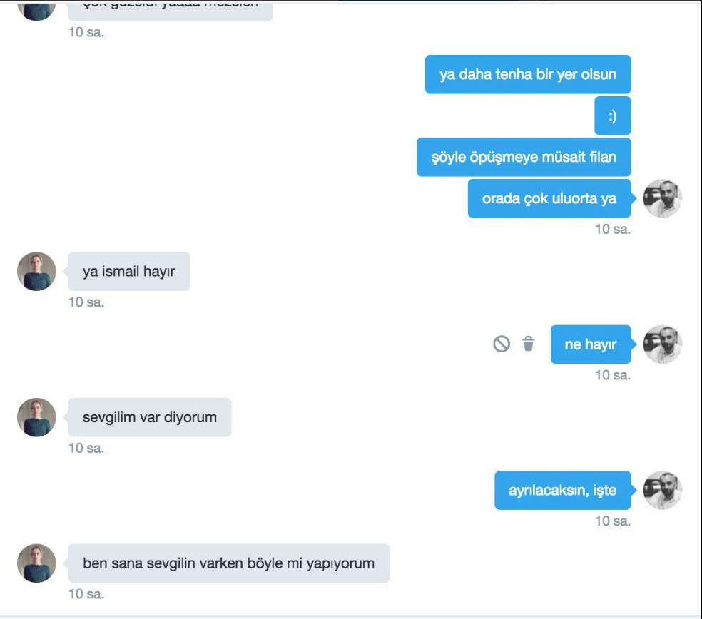 Saymaz: Hayır. Meltem ne zaman buluşalım? Seni güzel bir yere götüreceğim. Öpme işine orada karar veririz. Yıllardır bekliyorum. Beklerim bir iki ay daha dert değil.