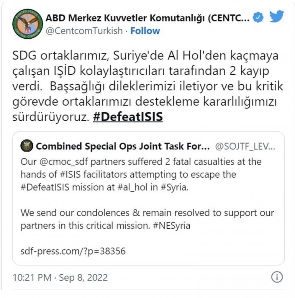 Mesajda, “SDG ortaklarımız, Suriye’de Al Hol'den kaçmaya çalışan IŞİD kolaylaştırıcıları tarafından 2 kayıp verdi. Başsağlığı dileklerimizi iletiyor ve bu kritik görevde ortaklarımızı destekleme kararlılığımızı sürdürüyoruz” denildi.