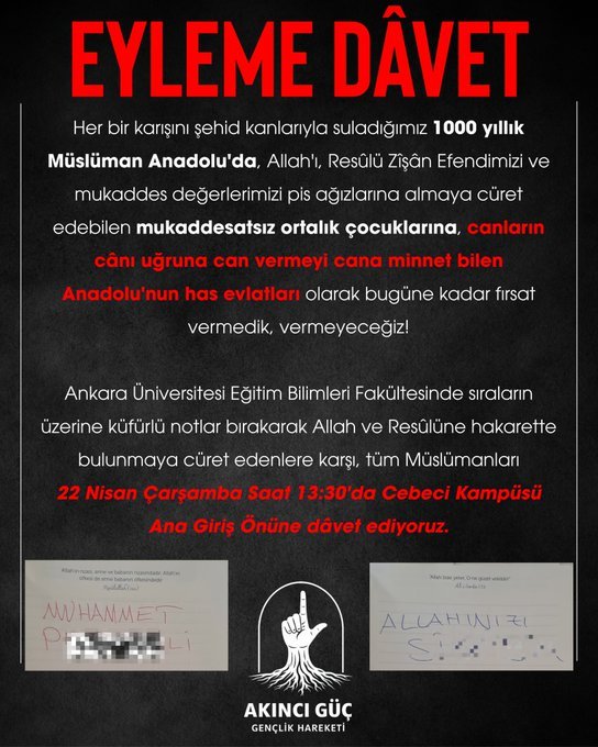 "Canların cânı uğruna can vermeyi cana minnet bilenler" şiarıyla tüm duyarlı öğrencileri birlik olmaya çağıranAkıncı Güç Gençlik Hareketi, mukaddesata yönelik bu saldırılara karşı sessiz kalmayacaklarını bildirdi. Söz konusu basın açıklaması, 22 Nisan Çarşamba günü saat 13:30'da Cebeci Kampüsü ana giriş önünde gerçekleştirilecek.