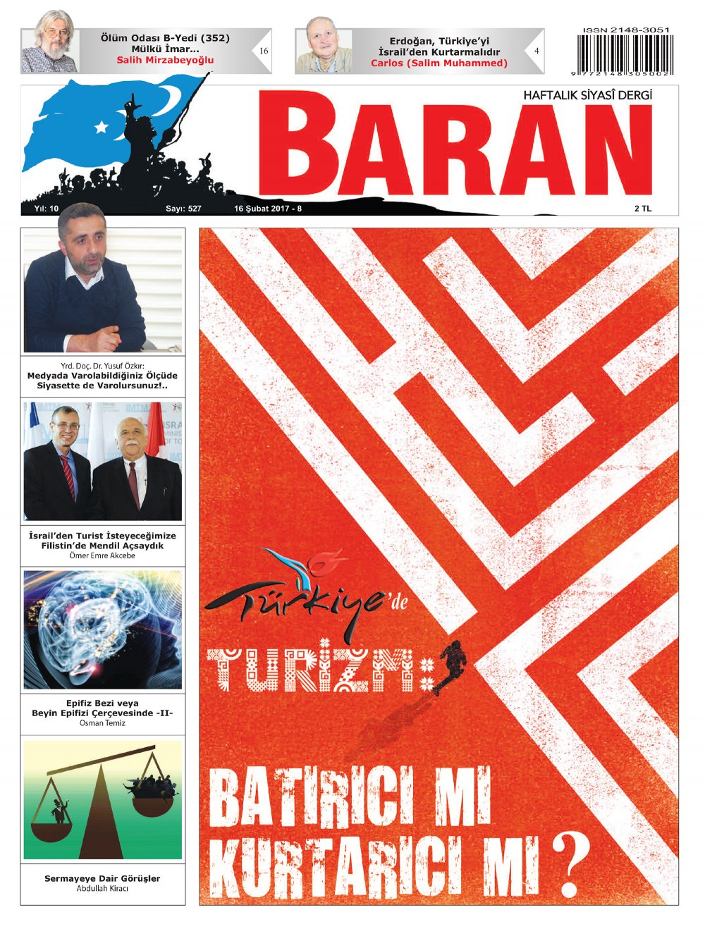 Kapağımızda temel dinamiklerinin ne olduğu daha yönetenlerce bilinmeyen ekonomimizin gelir kaynaklarından birisi olan “turizm” meselesine değindik ve “Türkiye’de Turizm: Batırıcı mı Kurtarıcı mı?” manşetini attık. Kapak mevzumuzu Ömer Emre Akcebe “İsrail’den Turist İsteyeceğimize Filistin’de Mendil Açsaydık” başlıklı yazısında işledi.