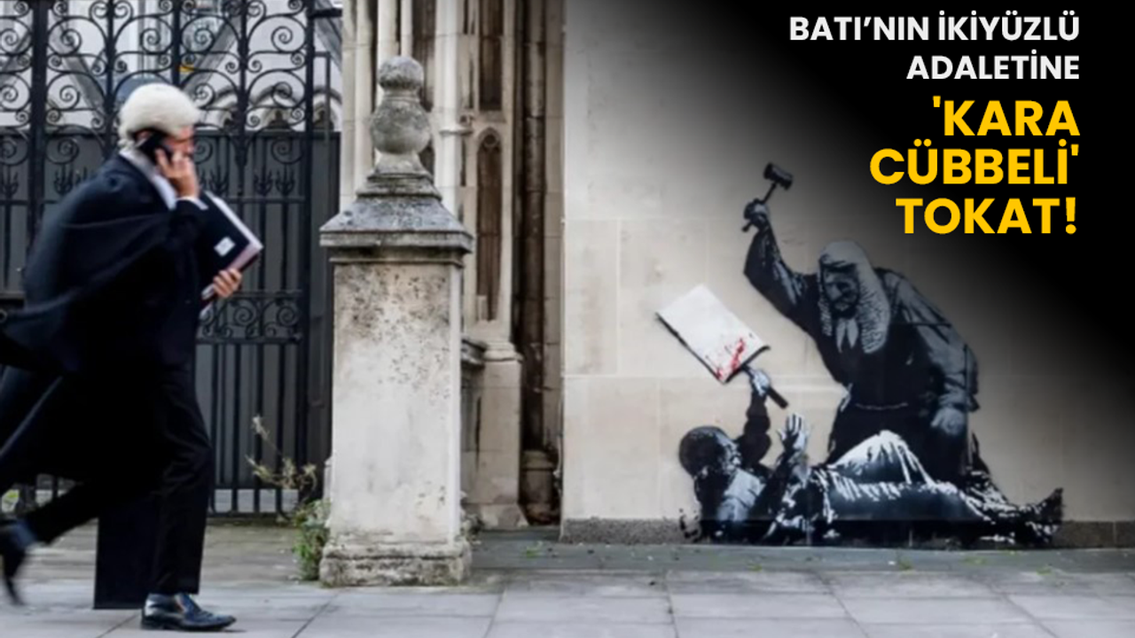 Banksy, duvar resminde siyah cübbesi ve peruğuyla bir yargıcı, yerde kanlar içinde yatan bir protestocuyu acımasızca ezerken tasvir ediyor. Adaletin tecelli etmesi beklenen bu mekânda, adalet sembolünün bizzat kendisi, Batı’nın kendi değerlerine nasıl ihanet ettiğinin bir kanıtı olarak duruyor. Batı, bir yandan demokrasi, insan hakları ve adalet masalları anlatırken, diğer yandan kendisine karşı çıkan her sesi şiddetle bastırıyor.