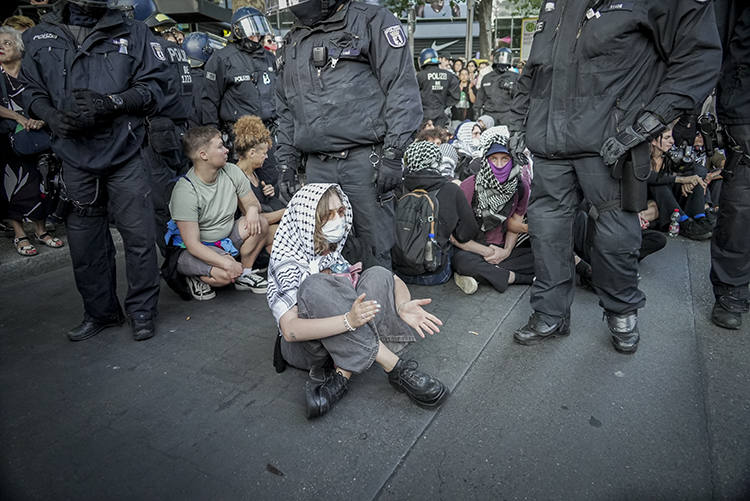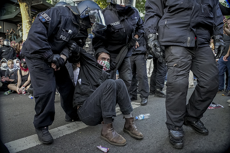 Eylem sürerken polis “gösteri sona erdi” anonsu yaparak alanı boşaltma emri verdi. Protestocular oturma eylemine geçince coplu, kalkanlı birlikler saldırıya başladı. Kadın-erkek demeden yere yatırılan aktivistler ters kelepçelenerek gözaltı araçlarına taşındı; Kurfürstendamm, Almanya’nın Filistinlilere reva gördüğü baskının simgesi hâline geldi.