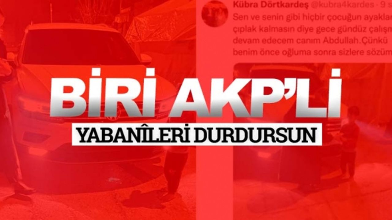 AKP Kadın Kolları MKYK üyesi Kübra Dörtkardeş, Kahramanmaraş merkezli depremlerin yaşanmasından iki hafta sonra son model arabası ile deprem bölgesine gitti. Kübra Dörtkardeş, ayakları çıplak ve montsuz bir çocuğa, meyve suyu ve bir parça kek verip sosyal medyadan bir fotoğraf paylaştı.
