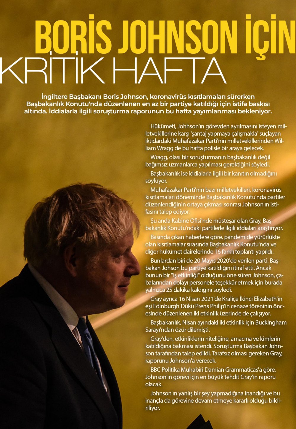 İngiltere Başbakanı Boris Johnson, koronavirüs kısıtlamaları sürerken Başbakanlık Konutu'nda düzenlenen en az bir partiye katıldığı için istifa baskısı altında. İddialarla ilgili soruşturma raporunun bu hafta yayımlanması bekleniyor.
