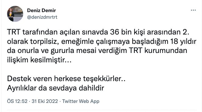 Demir, daha sonra Twitter adresinden paylaştığı mesajla TRT’den ilişiğinin kesildiğini duyurdu: “TRT tarafından açılan sınavda 36 bin kişi arasından 2’nci olarak torpilsiz, emeğimle çalışmaya başladığım 18 yıldır da onurla ve gururla mesai verdiğim TRT kurumundan ilişkim kesilmiştir… Destek veren herkese teşekkürler.. Ayrılıklar da sevdaya dahildir.”