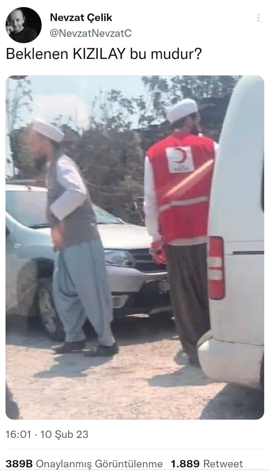 Örümcek kafalı Çelik, bir başka tivitinde ise eski depremlerden kalan bir fotoğrafı yeniymiş gibi paylaşıp, deprem bölgesinde depremzedeler için mücadele eden Türk Kızılay ekibinden iki şalvarlı ve sarıklı şahsın fotoğrafına “Beklenen Kızılay bu mudur?” diyerek hem nefretini izhar etti hem de hedef gösterdi. Hem “neden deprem bölgelerinde yoklar” diye paylaşım yapan, ardından da deprem bölgelerinde olan Müslümanlara da “niye bunlar gitmiş” diyebilecek kadar alçalıyorlar.