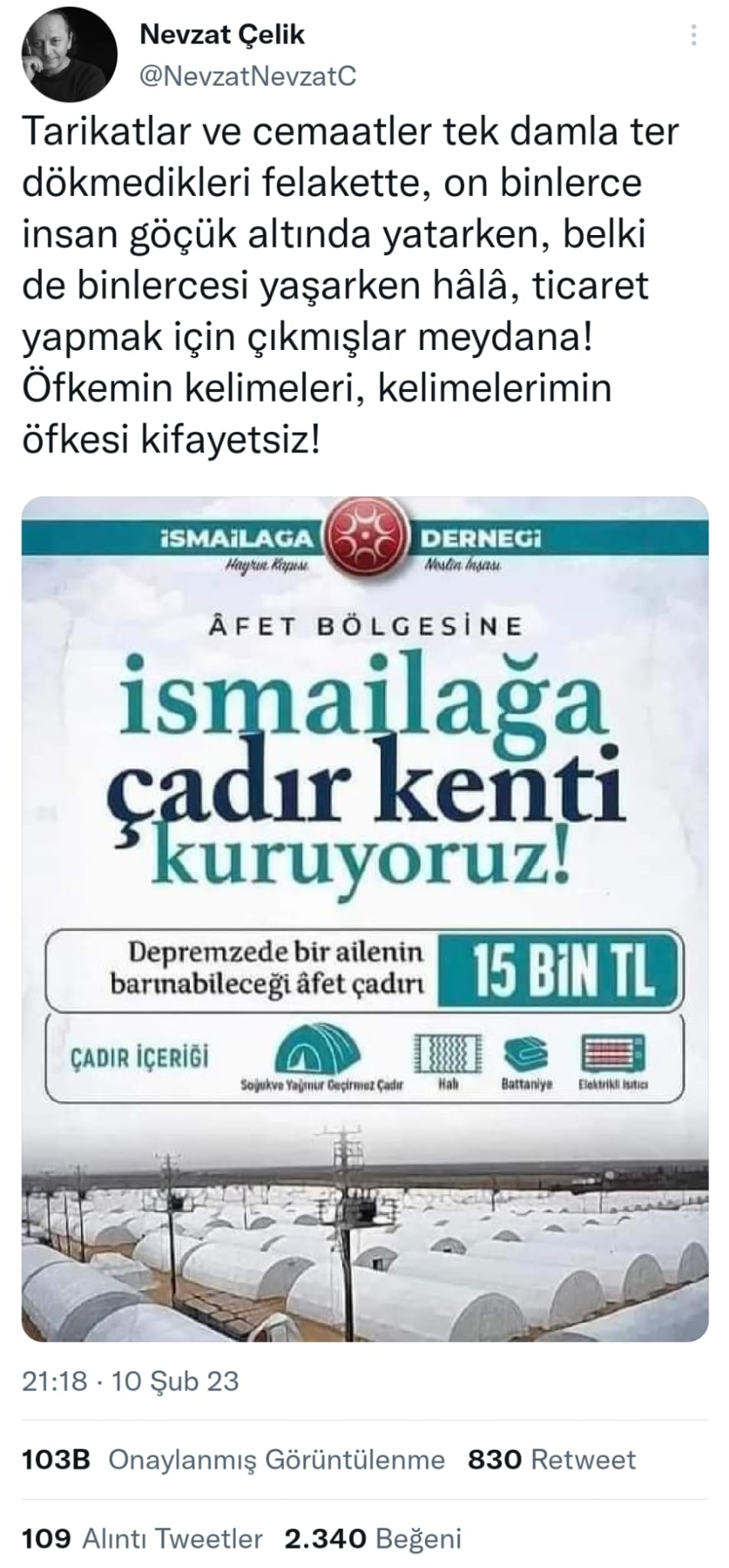 Kemalistlerin “şair”lerinden Nevzat Çelik, İsmailağa Derneği’nin deprem bölgelerine sağladığı afet çadırı için “ticaret yapıyorlar” iftirasını attı. Çelik, “Tarikatlar ve cemaatler tek damla ter dökmedikleri felakette, on binlerce insan göçük altında yatarken, belki de binlercesi yaşarken hâlâ, ticaret yapmak için çıkmışlar meydana! Öfkemin kelimeleri, kelimelerimin öfkesi kifayetsiz.” dedi.