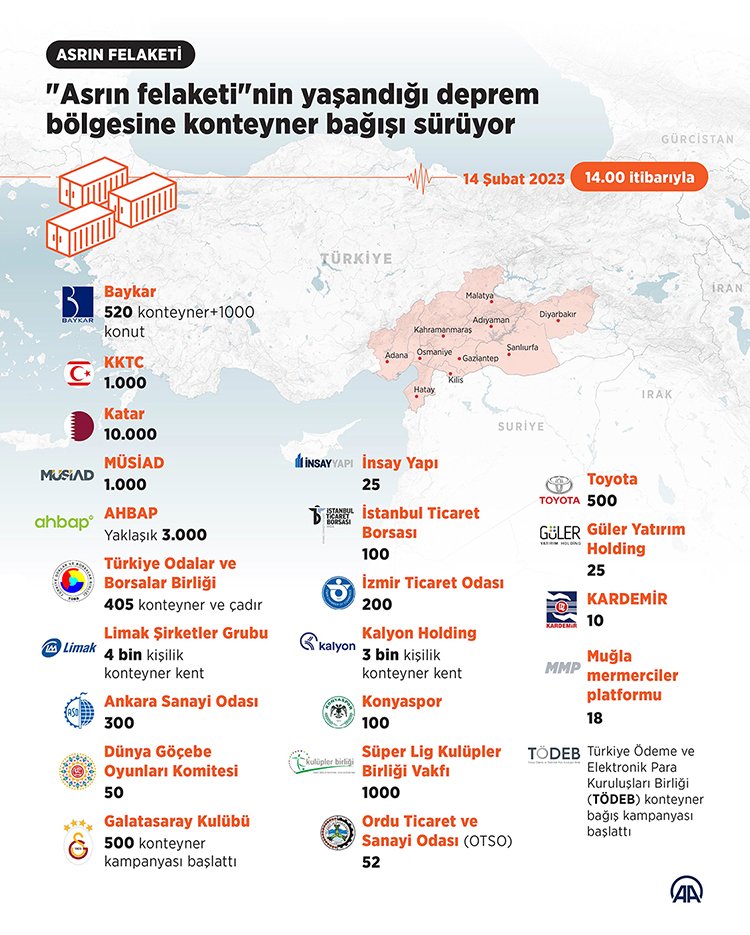 Galatasaray Kulübü'nün barınma ihtiyacına yönelik 500 konteyner hedefiyle başlattığı kampanya devam ederken, İnsay Yapı 25, İstanbul Ticaret Borsası 100, İzmir Ticaret Odası 200 konteyner desteği yapacağını duyurdu.