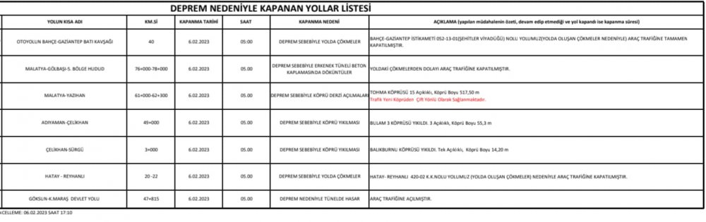 Karayolları Genel Müdürlüğünün yol durumu bülteni ve sosyal medya hesabından yapılan paylaşımlara göre, TAG Otoyolu'nun Osmaniye-Gaziantep Batı Kavşağı'nda deprem nedeniyle otoyol gövdesinde oluşan hasardan dolayı yol ulaşıma kapatıldı. Bu kesimde sürücüler D-400 Devlet yoluna yönlendiriliyor.