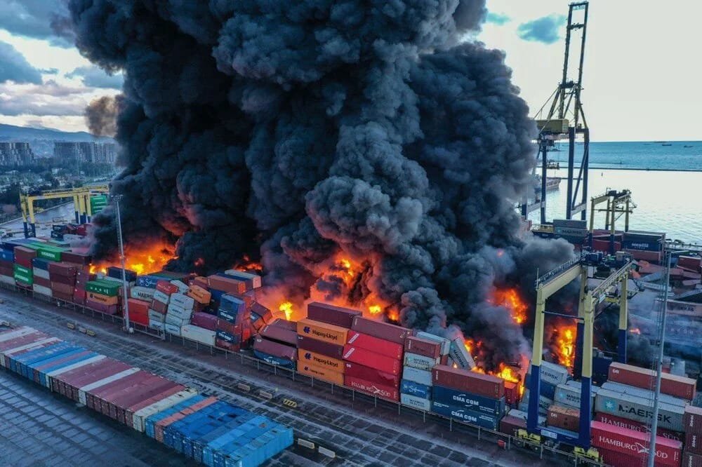 07.10 İskenderun Limanı'nda depremde devrilen konteynerlerde çıkan yangın devam ediyor.