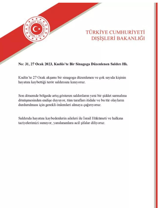 Açıklamada, "Kudüs'te 27 Ocak akşamı bir sinagoga düzenlenen ve çok sayıda kişinin hayatını kaybettiği terör saldırısını kınıyoruz." ifadesi kullanıldı.