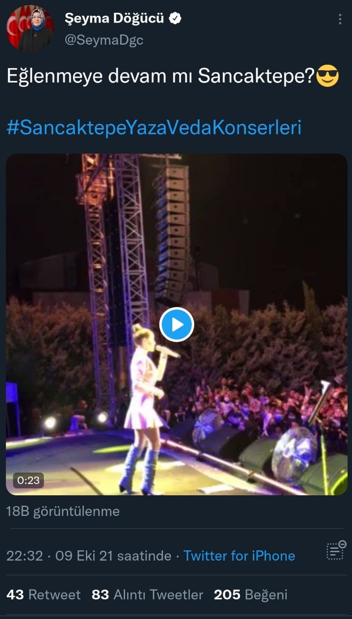 Her ne kadar iktidar kabul etmese de iktisadî bakımdan büyük sıkıntıların yaşandığı memleketimizde milyonlarca lira para dökülerek yapılan bu saçmalığı Sancaktepe’nin Ak Partili Belediye Başkanı Şeyma Döğücü de sosyal medya hesaplarından yaptığı paylaşımlarla duyurdu. Döğücü, sosyal medya hesabından "Eğlenmeye devam mı Sancaktepe?" diye sordu.