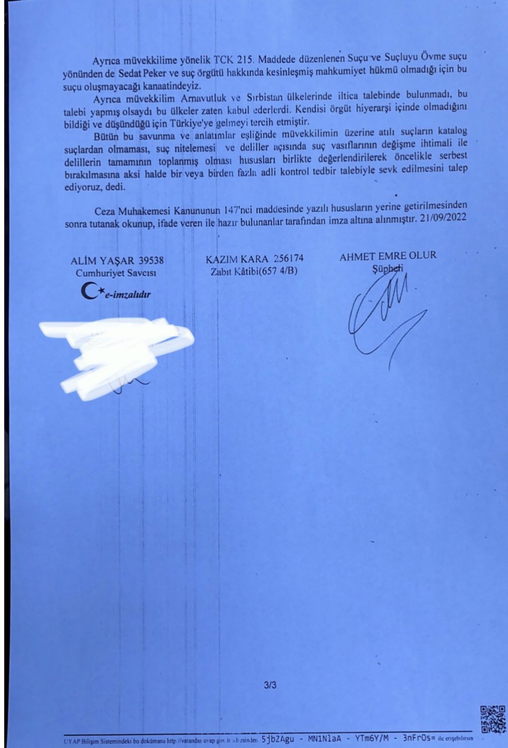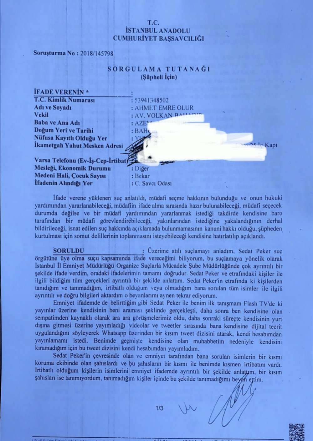 Olur hakkında düzenlenen sevk yazısında, şüphelinin suç örgütü lideri Sedat Peker ile yakın ilişkisi içerisinde olduğu, örgüt liderinin WhatsApp üzerinden kendisine gönderdiği Tweet dizisini paylaştığı, örgüt liderinin kaldığı otelde ve villada 7,5 ay kadar birlikte kaldığı belirtildi.