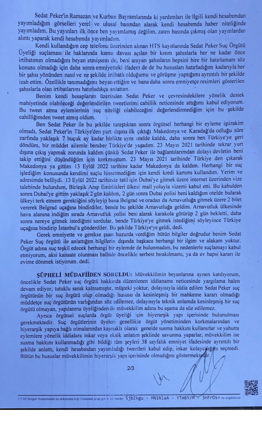 Ben Sedat Peker ile bu şekilde tanıştıktan sonra örgütsel herhangi bir eyleme iştirakim olmadı, Sedat Peker’in Türkiye'den yurt dışına ilk çıktığı Makedonya ve Karadağ'da odluğu süre şartında yaklaşık 7 buçuk ay kadar birlikte ayni otelde kaldık, daha sonra ben Türkiye'ye geri döndüm, bir müddet ailemle beraber Türkiye'de yaşadım…”
