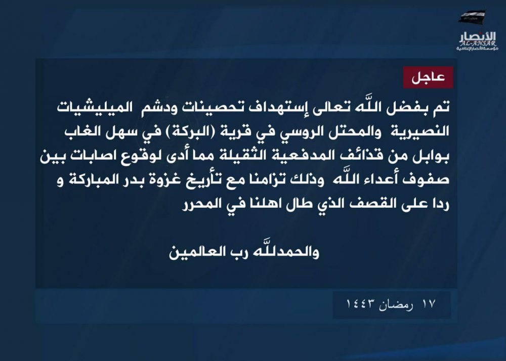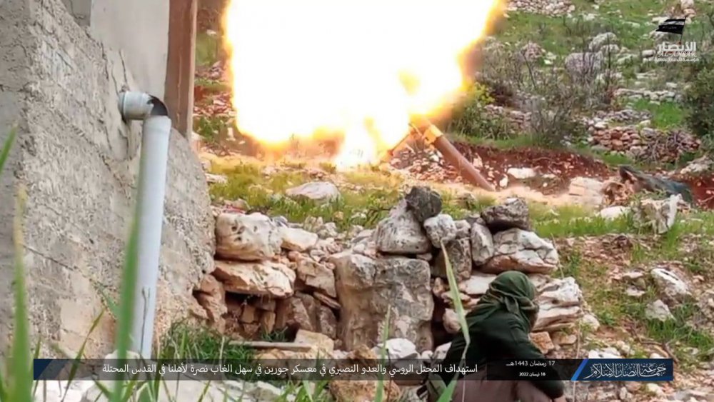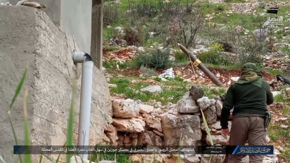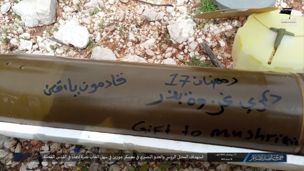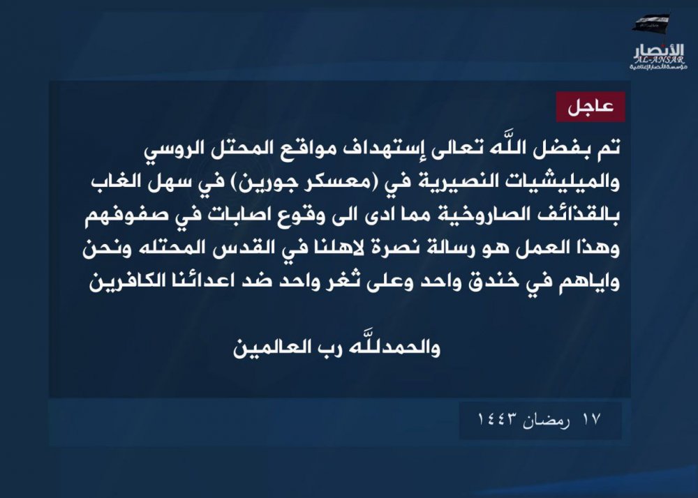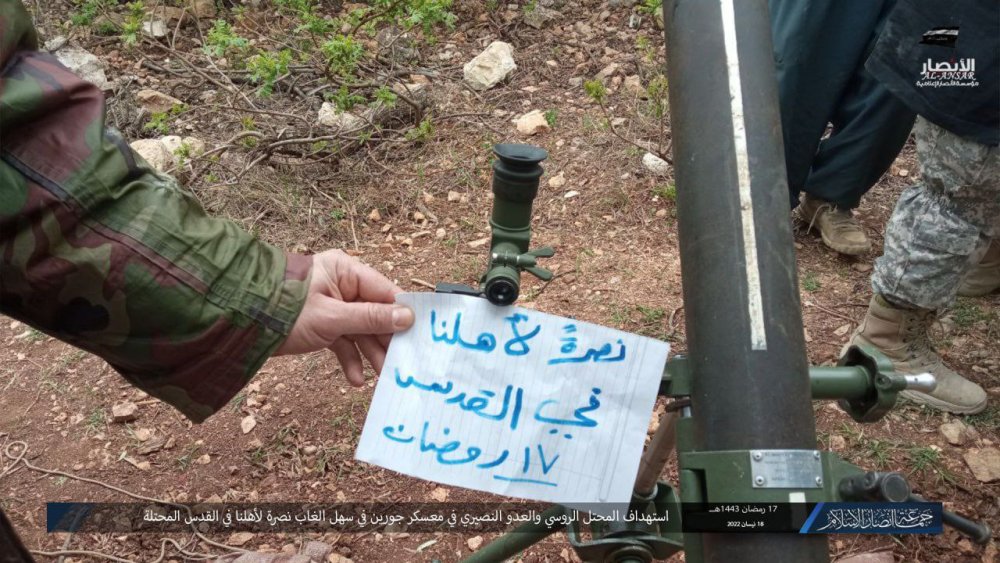 "Yüce Allah'ın lütfuyla Gab Ovası'ndaki (Curin Kampında) Rus işgalci ve Nusayri milislerin mevzileri füzeler ve toplar ile hedef alınmış ve can kayıplarına yol açmıştır. Bu eylem, işgal altındaki Kudüs'teki halkımıza bir destek mesajıdır ve biz ve onlar aynı hendekte ve kafir düşmanlarımıza karşı aynı cephedeyiz.
