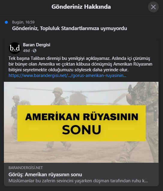 Tatlı’nın yazısını “Müslümanlar bu zaferin sevincini yaşarken düşman tarafından ruhu köleleştirilmiş münafık sürüleri, Amerika’nın gene bir hesap peşinde olduğunu iddia ederek bu zafere gölge düşürmeye çalışıyor.” spotuyla paylaşırken, Facebook’tan tarafımıza “Devam eden Topluluk Standartları ihlalleri nedeniyle sayfanın yayından kaldırılma riski var. Ayrıca dağıtımı azaltıldı ve başka kısıtlamalar uygulandı.” mesajı geldi.