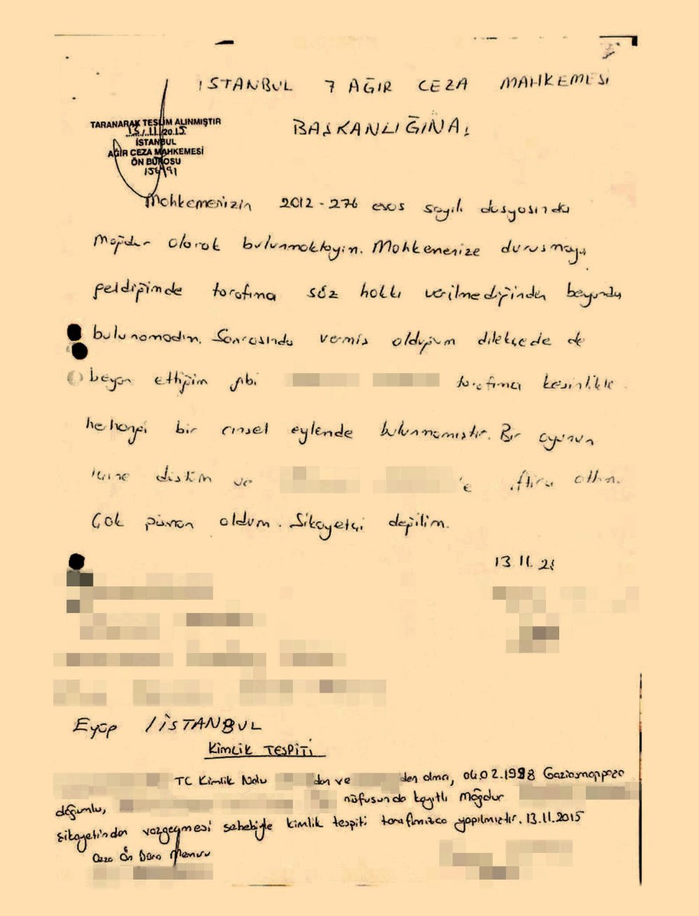 Duruşmadan sonra mağdur sıfatıyla yer alan kişiler iftira attıklarına ilişkin dilekçeleri mahkeme başkanına iletti. Öğrencilerin 2015 yılında İstanbul 7. Ağır Ceza Mahkemesi Başkanlığı’na gönderdikleri dilekçelerde “M.Ş. tarafıma kesinlikle herhangi bir cinsel eylemde bulunmamıştır. M.Ş’ye iftira attım. Çok pişman oldum, şikayetçi değilim” ifadeleri yer aldı. Müştekilerin açıkça M.Ş.’ye iftira attıklarını beyan etmesi üzerine yargılanmanın yenilenmesi talebinde bulunuldu.