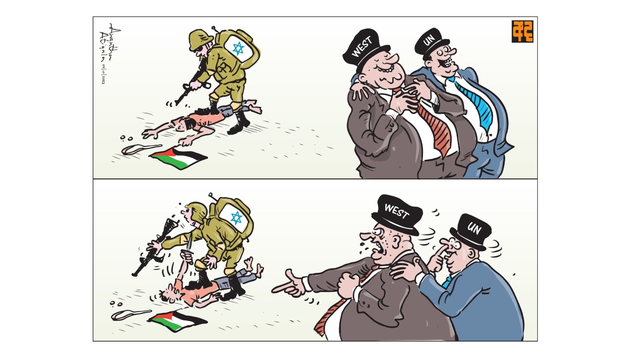 Batı’nın ‘objektif’inden İsrail-Gazze Savaşı. Taş atan terörist; binlerce cana kıyan tüfekler, tanklar, füzeler ‘meşru müdafaa.’ Karikatürist: Rafat Alkhatib