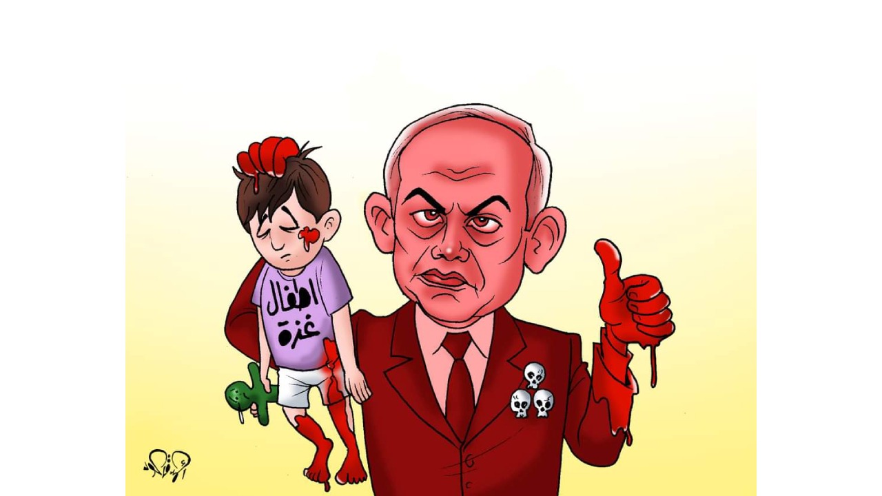 Baştan aşağı kana bürünmüş ve aldığı canları göğsüne bir madalyaymışçasına iliştirmiş Netanyahu ve kıydığı binlerce masum çocuktan biri… Karikatürist: Ahmad Qaddura