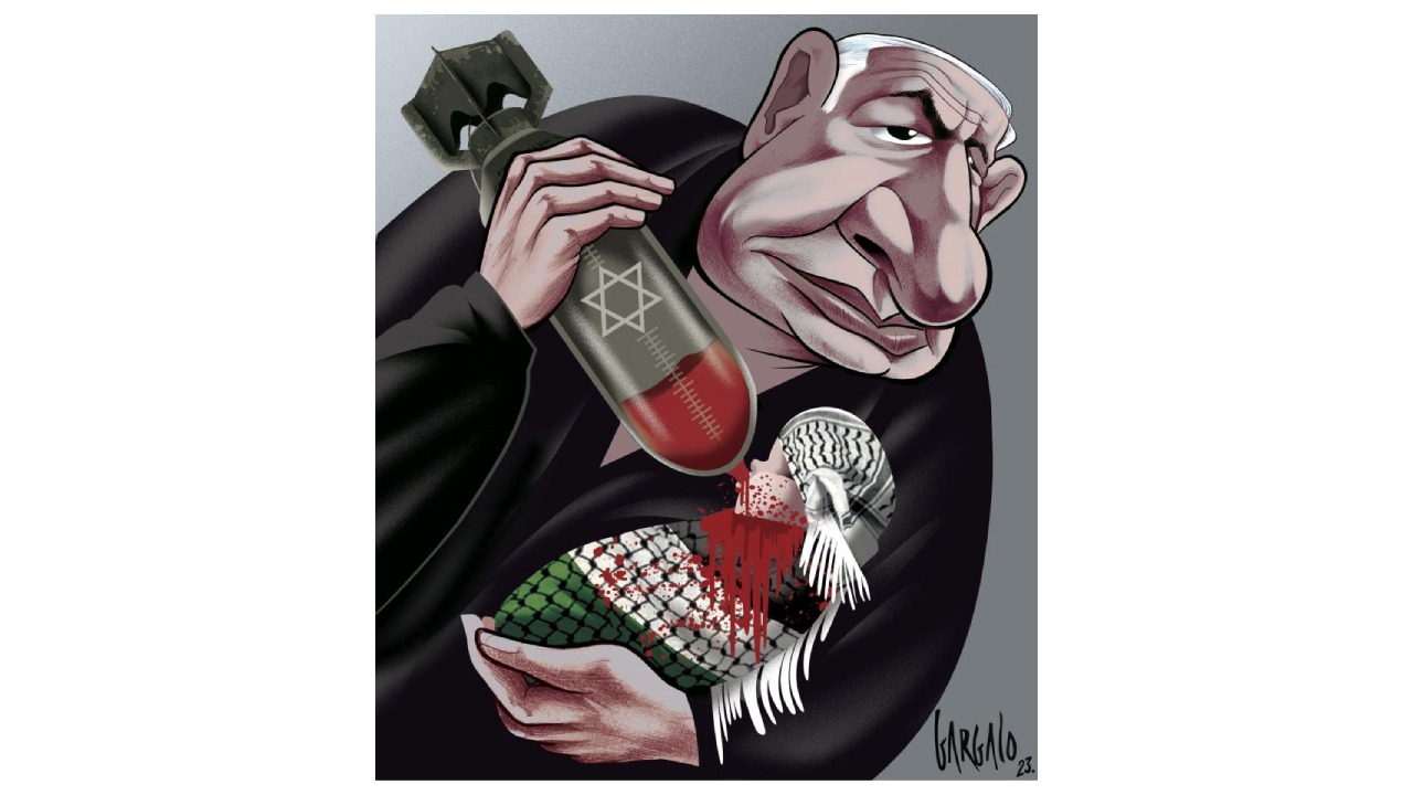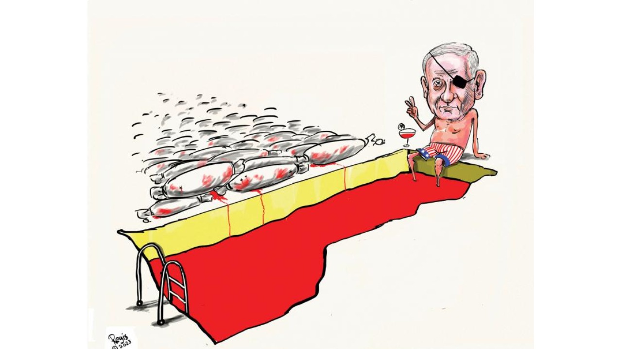 Gazze’yi adeta cehenneme çevirip soykırım yapan Netanyahu ve ABD Başkanı Biden’ın ona koşar adımlarla mühimmat yetiştirme çabası… Karikatürist: Mahmoud Rifai