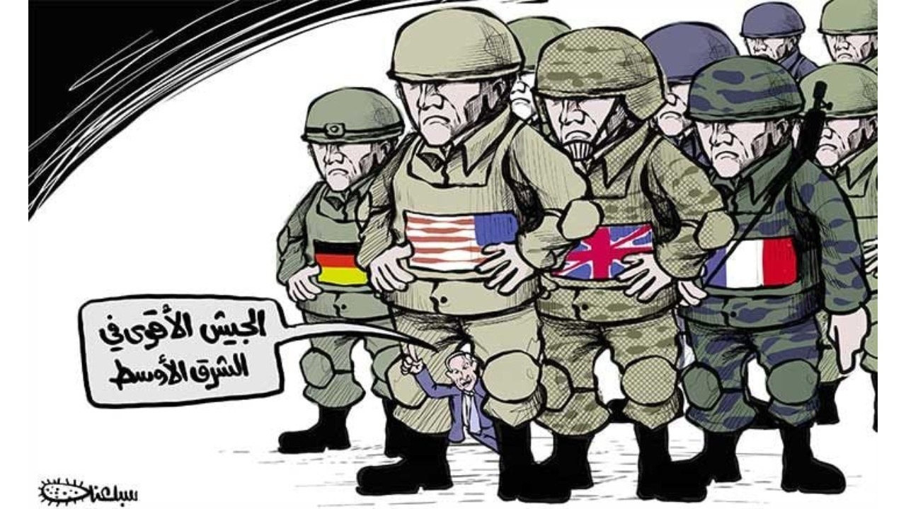 "Ortadoğunun en güçlü ordusu" diye başkaldıran Netanyahu ve arkasında sponsor devletleri Karikatürist Mohammad Sabaaneh böyle yorumladı. Sabanneh`e göre Netanyahu sponsorları arkasında olmasa yanlarında ezilecek kadar küçük. Kendi başına hareket edemeyecek kadar zayıf.