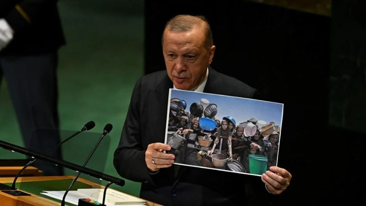 Filistin zirvesine dönüşen BM Genel Kurulu'nda Cumhurbaşkanı Recep Tayyip Erdoğan, beklenen konuşmasını yaptı. Erdoğan konuşmasında Gazze'de yaşanan vahşete ilişkin fotoğraflar gösterdi. Cumhurbaşkanı Erdoğan'ın tarihi konuşmasından satır başları şöyle: