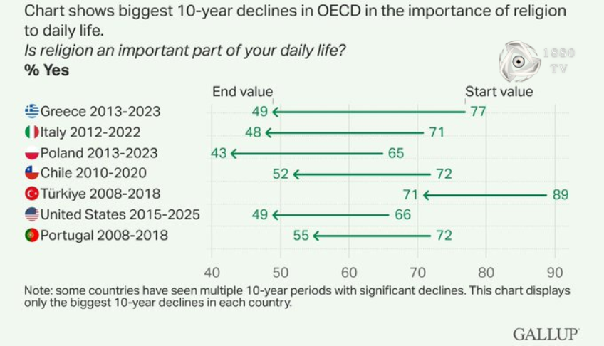 Gallup, 160’tan fazla ülkenin verisini incelediği çalışmada, 10 yıllık herhangi bir dönemde 15 puanın üzerinde düşüş yaşayan ülke sayısının yalnızca 14 olduğunu vurguluyor. Buna karşın dünya genelinde dinin günlük hayatta önemli olduğunu söyleyenlerin oranı yaklaşık 20 yıldır yüzde 80’in üzerinde sabit seyrediyor.