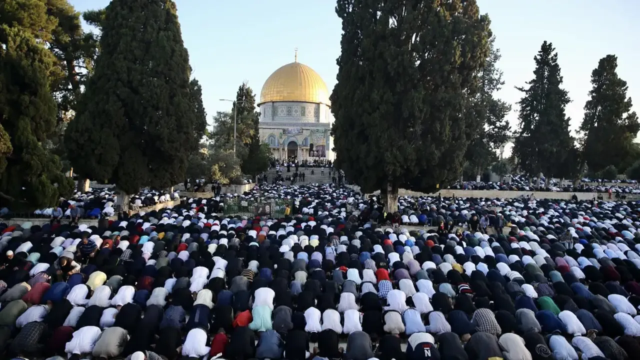 Yaklaşık 120 bin Müslüman, Ramazan Bayramı namazı için sabah saatlerinde mukaddes mabedimiz Mescid-i Aksa'da saf tuttu.