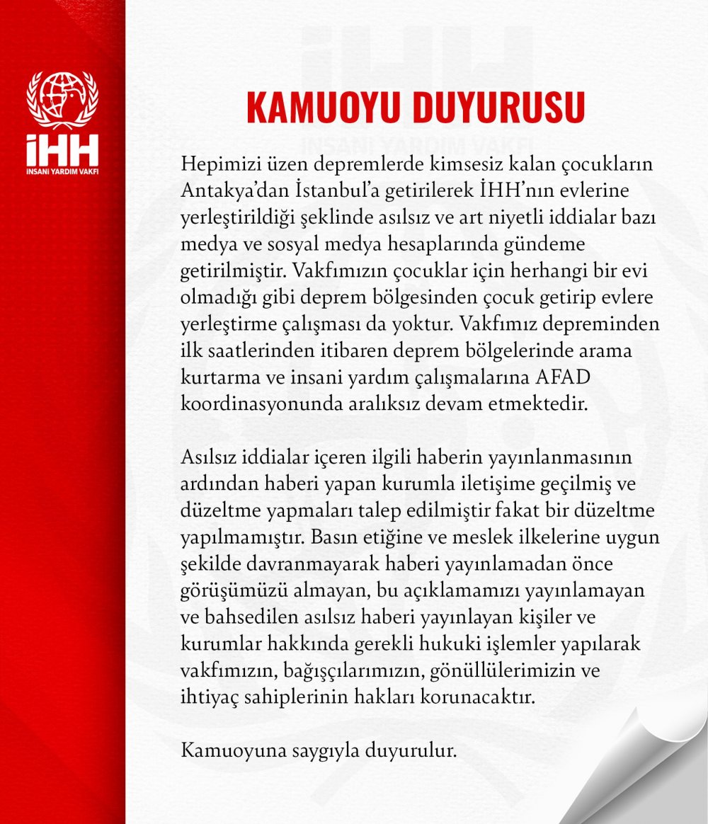 Depremlerde kimsesiz kalan çocukların, Antakya’dan İstanbul’a getirilerek İHH’nın evlerine yerleştirildiği şeklinde asılsız ve art niyetli iddialar hakkında kamuoyuna duyurumuzdur.