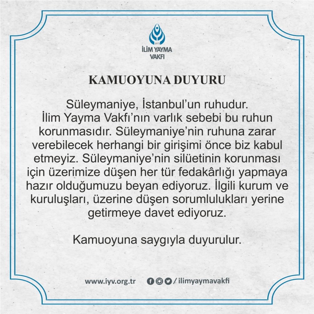 Açıklamada, "Süleymaniye, İstanbul’un ruhudur. İlim Yayma Vakfı’nın varlık sebebi bu ruhun korunmasıdır. Süleymaniye’nin ruhuna zarar verebilecek herhangi bir girişimi önce biz kabul etmeyiz. Süleymaniye’nin silüetinin korunması için üzerimize düşen her tür fedakarlığı yapmaya hazır olduğumuzu beyan ediyoruz. İlgili kurum ve kuruluşları, üzerine düşen sorumlulukları yerine getirmeye davet ediyoruz." denildi.