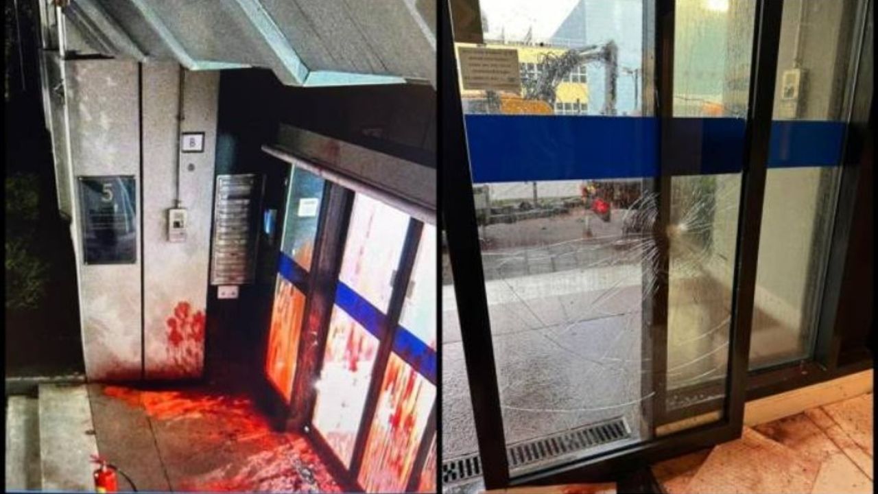 İsrail'in Lahey Büyükelçiliği, X sosyal medya platformu hesabından yaptığı paylaşımda, Lahey Büyükelçiliğinin girişine zarar verildiği ve kırmızı boya atıldığını kaydetti.