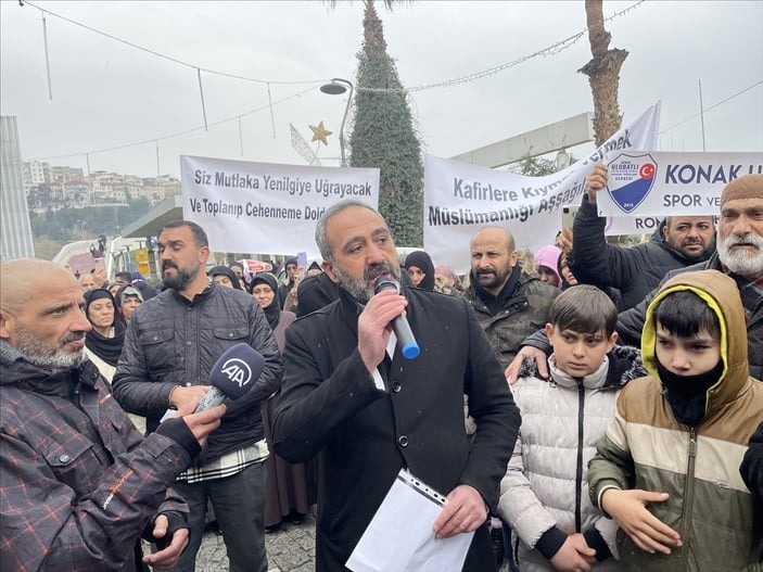 İzmir'de Konak Meydanı'nda toplanan dernek üyeleri, dövizlerle tekbir getirip, slogan atarak Konak Metro İstasyonu'na kadar yürüdü.