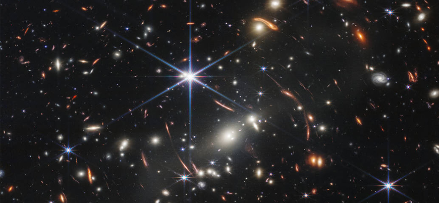 NASA'nın paylaştığı fotoğrafta James Webb teleskobu, SMACS 0723 olarak adlandırılan ön plandaki bir galaksi kümesini kozmik bir büyüteç gibi kullanarak arkasındaki çok uzak ve soluk galaksileri görüntüledi.