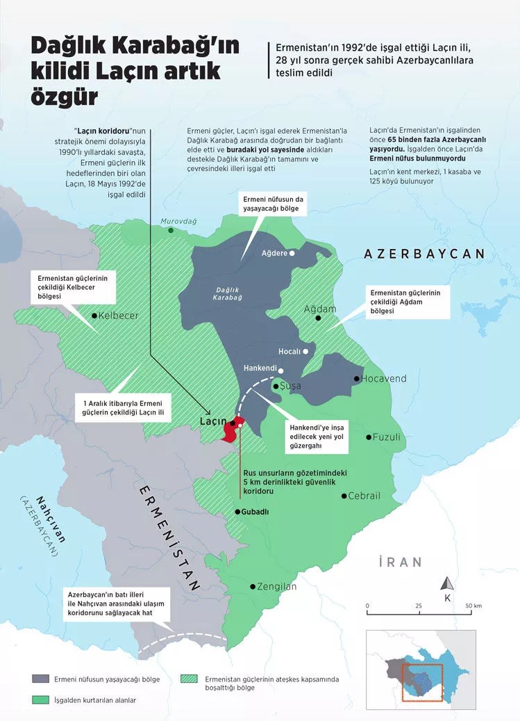 Azerbaycan Cumhurbaşkanı İlham Aliyev resmi Twitter sayfasından yaptığı açıklamada, Laçin şehrinin Azerbaycan Ordusu’nun kontrolüne geçtiğini duyurdu.