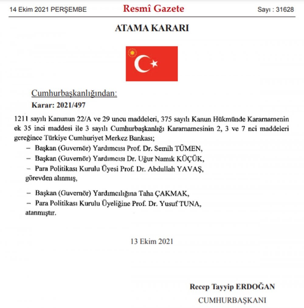 Boşalan Merkez Bankası Başkan Yardımcılığı koltuğuna BDDK Başkan Yardımcısı Taha Çakmak oturdu. PPK Üyeliğine ise Yusuf Tuna atandı. Kararın yayımlanmasından sonra dolar 9.09 liradan 9.17 liranın üzerine tırmandı ve tarihi rekor kırdı.