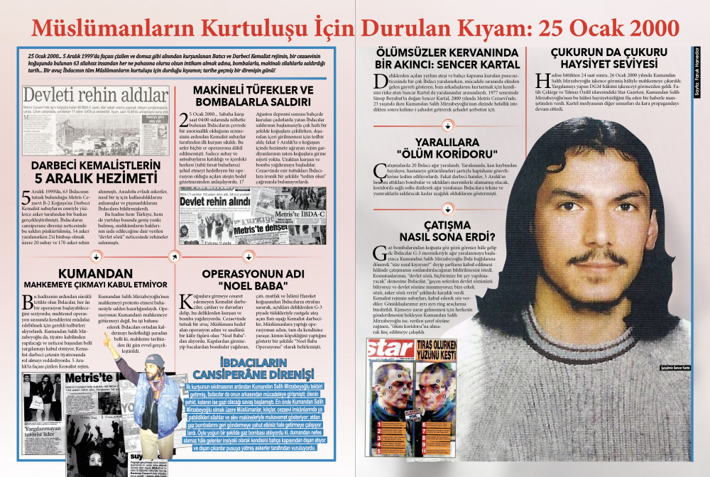 25 Ocak 2000... 5 Aralık 1999’da façası çizilen ve domuz gibi alnından kurşunlanan Batıcı ve Darbeci Kemalist rejimin, bir cezaevinin koğuşunda bulunan 63 silahsız insandan her ne pahasına olursa olsun intikam almak adına, bombalarla, makinalı silahlarla saldırdığı tarih... Bir avuç İbdacının tüm Müslümanların kurtuluşu için durduğu kıyamın; tarihe geçmiş bir direnişin günü!