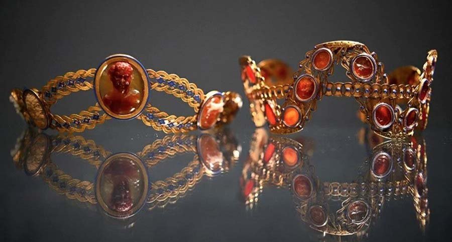 Akikten oyma taçların bir takı setinin parçası olarak, küpeleri, kemer süsü ve tarağıyla birlikte sahibine gideceği söylendi.