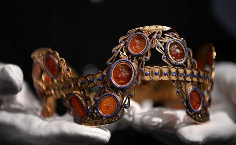 İkinci altın ve emaye taç, antik “Yunan tanrıları” Zeus, Dionysos, Medusa, Pan ve Gaia'nın akik ve yeşimden minyatür portrelerini içeriyor.