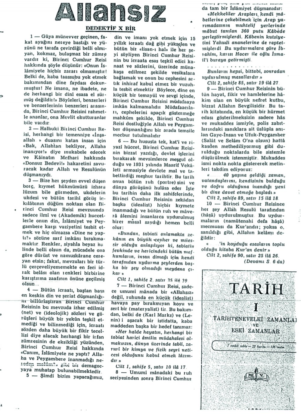 5- Şimdi bizim yapacağımız, din ve imanı yok etmek için 15 yıllık icraatı dağ gibi yükselen ve bütün bir «lisan-ı hal» ile her şeyi söyliyen Birinci Cumhur Reisinin bu icraata esas teşkil edici kanaat ve sözlerini, üzerinde münakaşa edilmez şekilde vesikalara bağlamak ve onun bu cephesini artık inhiraf kabul etmez bir vuzuhla tesbit etmektir. Böylece, dine en küçük bir temayül ve sevgi içinde, Birinci Cumhur Reisini müdafaaya imkân kalmamalıdır. Müdafaacıları, cephelerini apaçık göstermeğe mahkûm şekilde, Birinci Cumhur Reisi dostluğiyle Allah ve Peygamber düşmanlığını bir arada temsile mecbur tutulmalıdır.