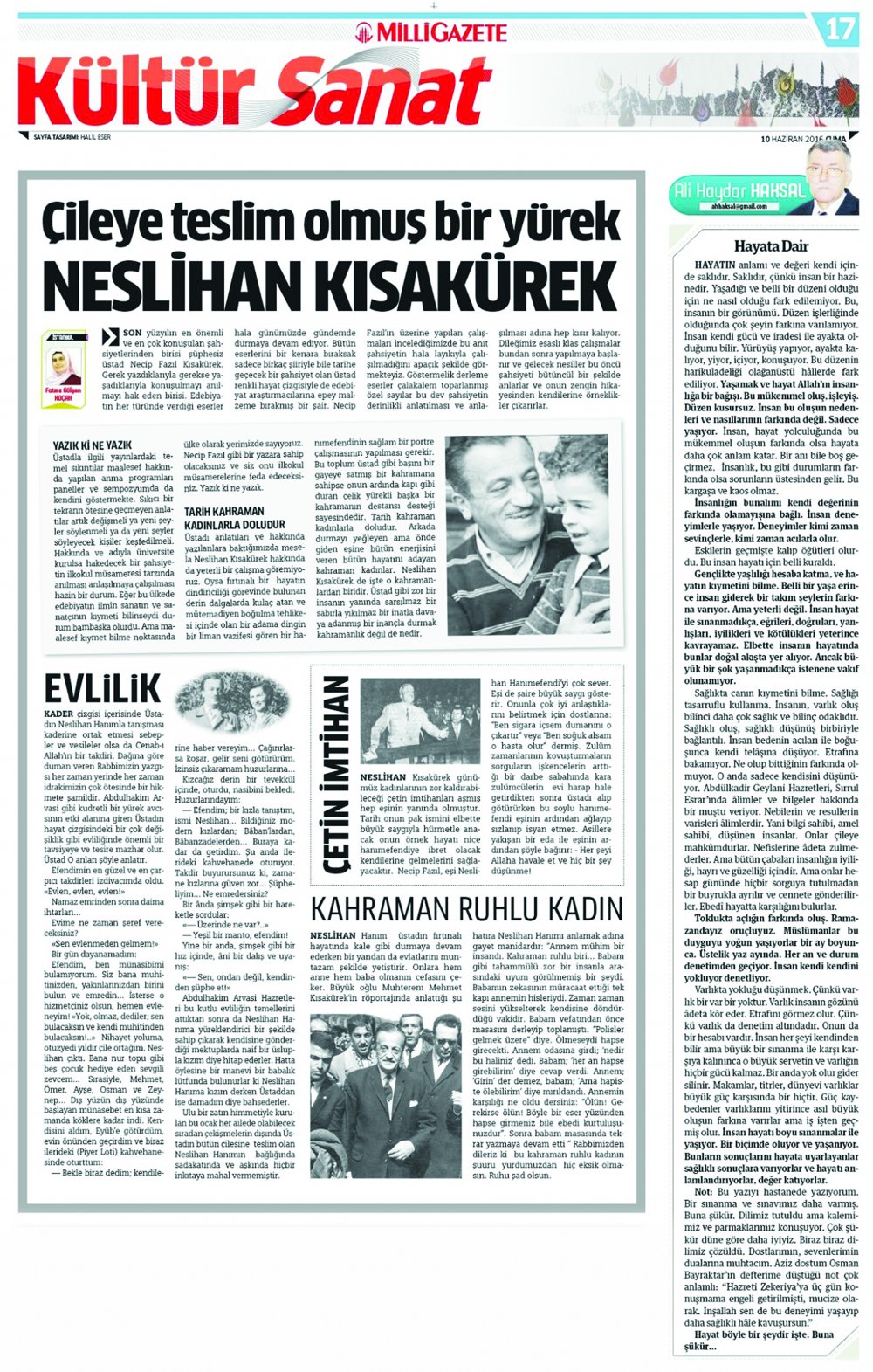 - “Büyük oğlu Muhterem Mehmet Kısakürek’in röportajında anlattığı şu hatıra, Neslihan Hanımı anlamak adına gayet manidardır: “Annem mühim bir insandı. Kahraman ruhlu biri... Babam gibi tahammülü zor bir insanla arasındaki uyum görülmemiş bir şeydi. Babamın zekâsının müracaat ettiği tek kapı annemin hisleriydi. Zaman zaman sesini yükselterek kendisine döndürdüğü vakidir. Babam vefatından önce masasını derleyip toplamıştı. “Polisler gelmek üzere” diye. Ölmeseydi hapse girecekti. Annem odasına girdi; “nedir bu haliniz” dedi. Babam; “her an hapse girebilirim” diye cevap verdi. Annem; “girin” der demez, babam; “ama hapiste ölebilirim” diye mırıldandı. Annemin karşılığı ne oldu dersiniz: “Ölün! Gerekirse ölün! Böyle bir eser yüzünden hapse girmeniz bile ebedi kurtuluşunuzdur.” Sonra babam masasında tekrar yazmaya devam etti.”