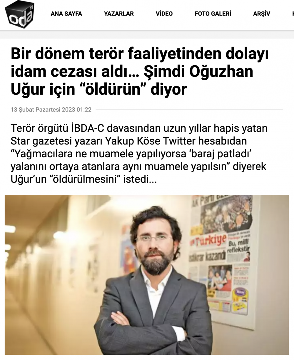 Açık bir manipülasyona başvuran OdaTV, haberde, 28 Şubat darbesinin Müslüman avı çerçevesinde 14 yaşında idamla yargılanan Yakup Köse için “Terör örgütü İBDA-C davasından uzun yıllar hapis yatan, yargılandığı dönemde idam cezası aldığını iddia eden Star gazetesi yazarı Yakup Köse Twitter hesabıdan “Yağmacılara ne muamele yapılıyorsa ‘baraj patladı’ yalanını ortaya atanlara aynı muamele yapılsın” diyerek Uğur’un “öldürülmesini” istedi.” ifadesini kullandı.