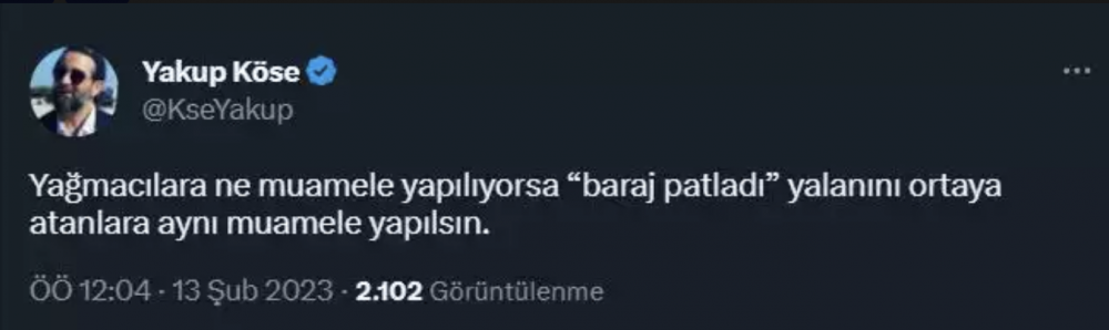 Star gazetesi yazarı Yakup Köse de bu mevzu hakkında bir twit atarak, “Yağmacılara ne muamele yapılıyorsa ‘baraj patladı’ yalanını ortaya atanlara aynı muamele yapılsın!” ifadesini kullandı.