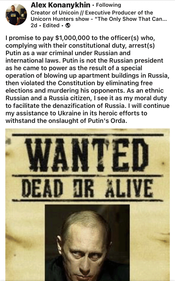 Alex Konanykhin tarafından yapılan paylaşımda Vladimir Putin'in görüntüsüne de yer verildi. O görüntüde, " Aranıyor! Ölü ya da diri " ifadelerine yer verildi.
