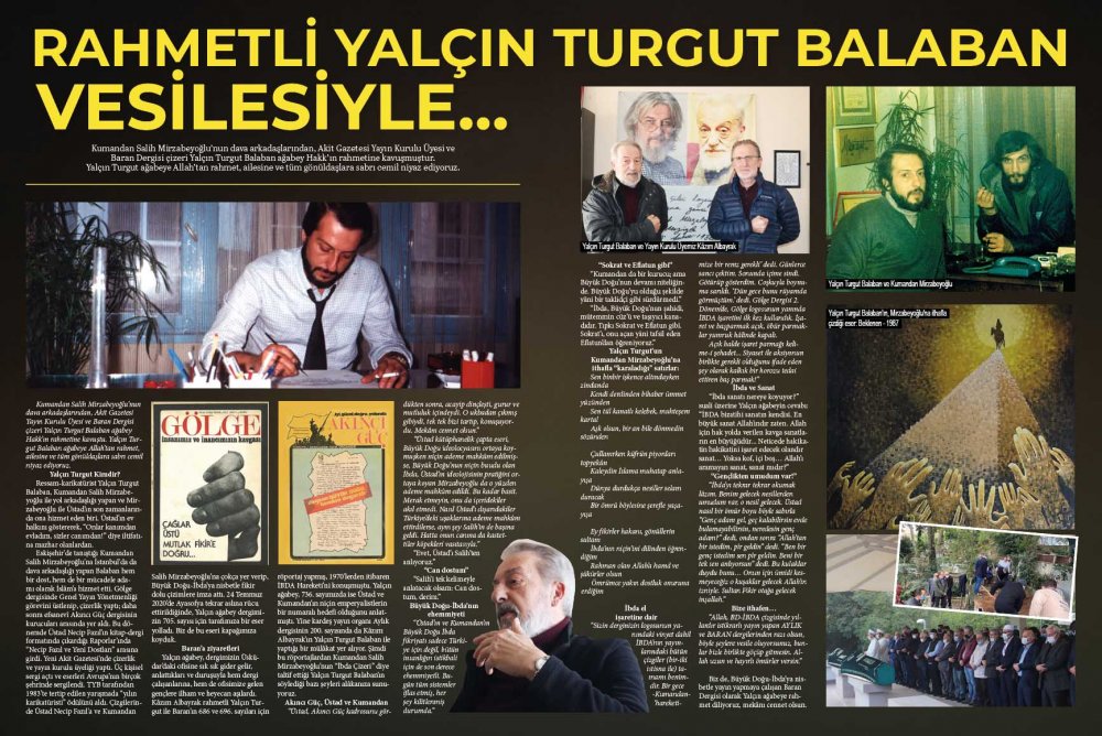 Kumandan Salih Mirzabeyoğlu’nun dava arkadaşlarından, Akit Gazetesi Yayın Kurulu Üyesi ve Baran Dergisi çizeri Yalçın Turgut Balaban ağabey Hakk’ın rahmetine kavuştu. Yalçın Turgut Balaban ağabeye Allah’tan rahmet, ailesine ve tüm gönüldaşlara sabrı cemil niyaz ediyoruz.