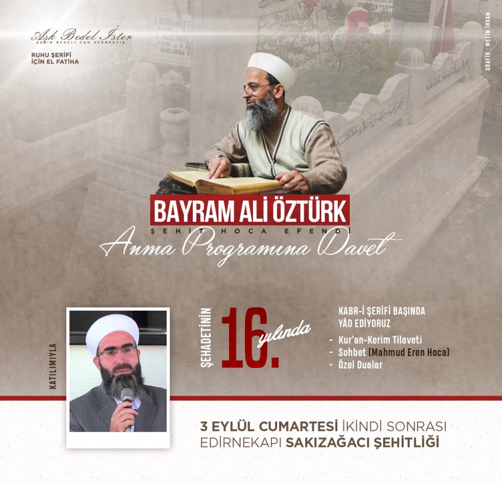 Bayram Ali Öztürk Hoca, şehadetinin 16. sene-i devriyesinde kabr-i şerifi başında yâd edilecek.