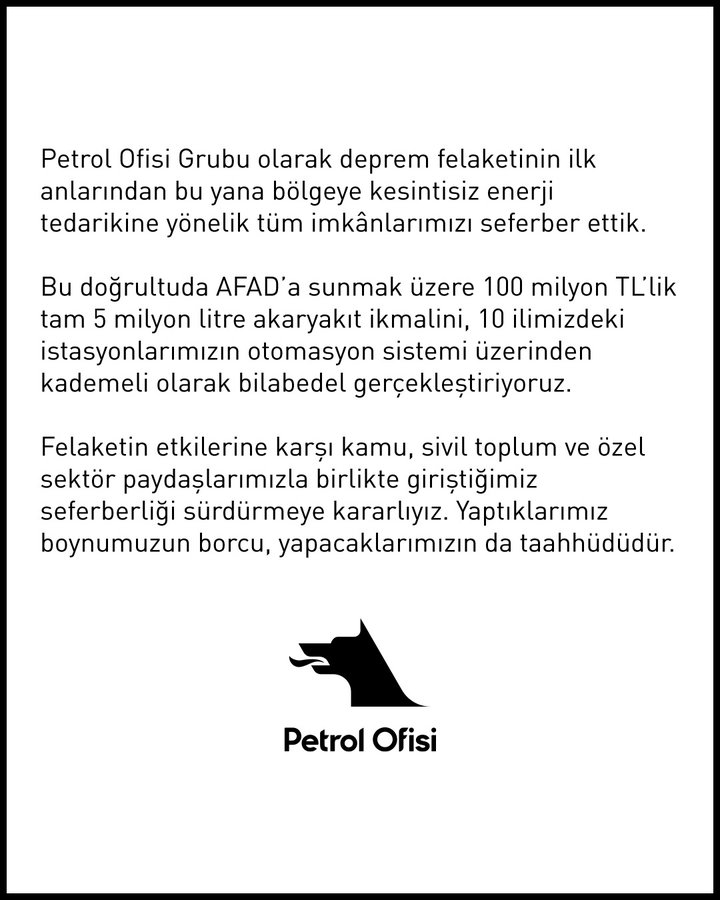 Petrol Ofisi’nden yapılan açıklamada, “Petrol Ofisi Grubu olarak deprem felaketinin ilk anlarından bu yana bölgeye kesintisiz eneriji tedarikine yönelik tüm imkânlarımızı seferber ettik. Bu doğrultuda AFAD'a sunmak üzere 100 milyon TĽlik tam 5 milyon litre akaryakıt ikmalini, 10 ilimizdeki istasyonlarımızın otomasyon sistemi üzerinden kademeli olarak bilabedel gercekleştiriyoruz. Felaketin etkilerine karsI kamu, Sivil toplum ve özel sektör paydaşlarımızla birlikte giriştiğimiz seferberliği sürdürmeye kararlıyız. Yaptıklarımız boynumuzun borcu, yapacaklarımızın da taahhüdüdür.” denildi.