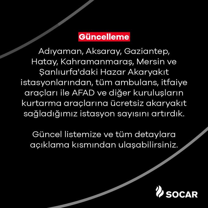 SOCAR yaptığı açıklamada, “Adıyaman, Aksaray, Gaziantep, Hatay, Kahramanmaraş, Mersin ve Şanlıurfa’daki Hazar Akaryakıt istasyonlarından, tüm ambulans, itfaiye araçları ile AFAD ve diğer kuruluşların kurtarma araçlarına ücretsiz akaryakıt sağladığımız istasyon sayısını artırdık. Güncel listemize ve tüm detaylara açıklama kısmından ulaşabilirsiniz.” dedi.