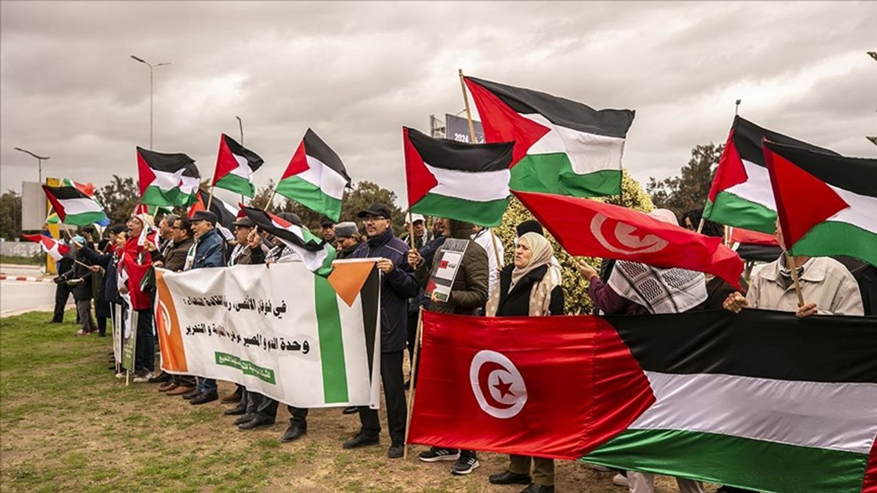 Başkent Tunus'un merkezindeki Tunus Belediye Tiyatrosu önünde toplanan göstericiler, Hamas ve İsrail arasında yapılan ateşkesin İsrail tarafından ihlal edilmesine tepki gösterdi.