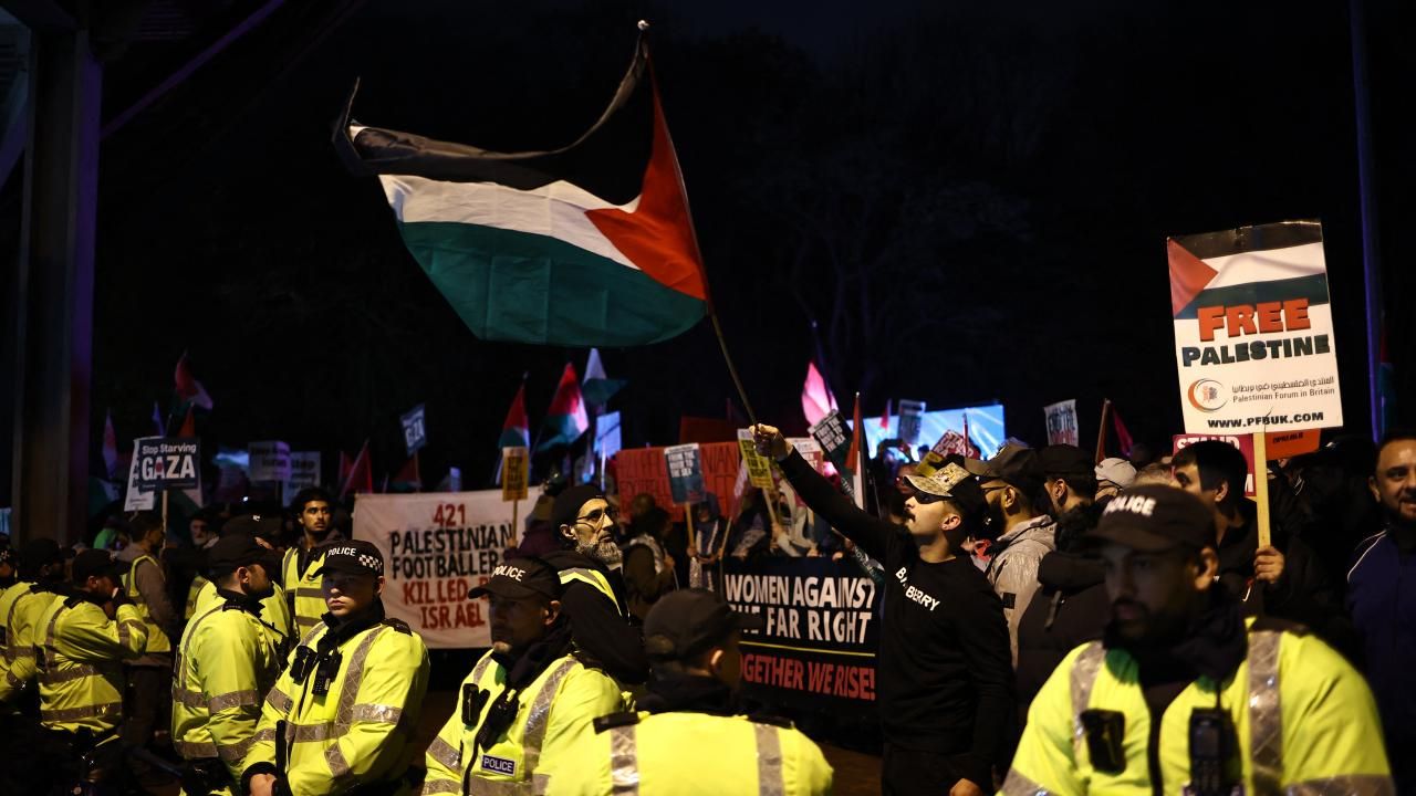 Filistin Dayanışma Kampanyası, Savaşı Durdur Koalisyonu, Britanya Müslümanlar Derneği, Al-Aqsa Dostları, Keşmir Dayanışma Kampanyası ve Britanya'daki Filistin Forumu'nun düzenlediği protestoya katılanlar Villa Park Stadı'nın önünde toplandı. "Özgür Filistin" sloganı atan ve stadın önüne dev Filistin bayrağı açan göstericiler, terörist İsrail'in uluslararası futbol karşılaşmalarından men edilmesini istedi.
