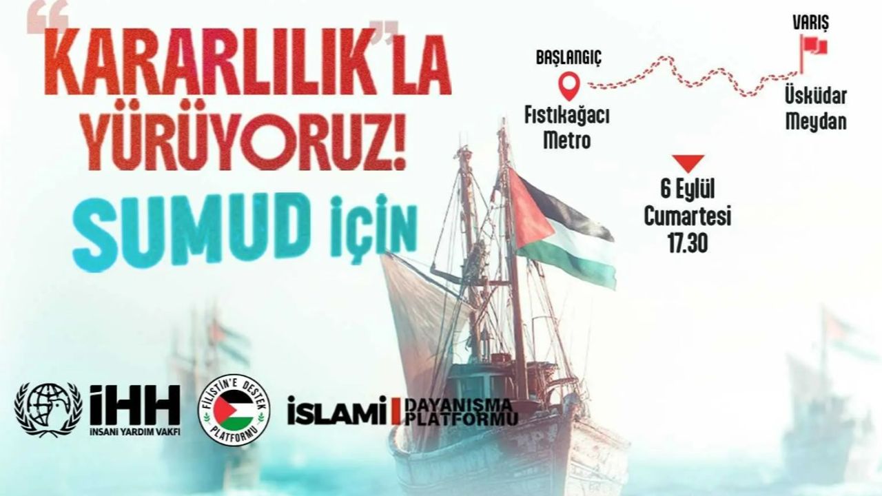 İHH İnsani Yardım Vakfı, İslami Dayanışma Platformu ve Filistin'e Destek Platformu tarafından Sumud Filosu'na destek vermek amacıyla Cumartesi günü Üsküdar'da yürüyüş düzenlenecek. Yürüyüş, saat 17.30'da Fıstıkağacı Metro Durağı önünden başlayacak.